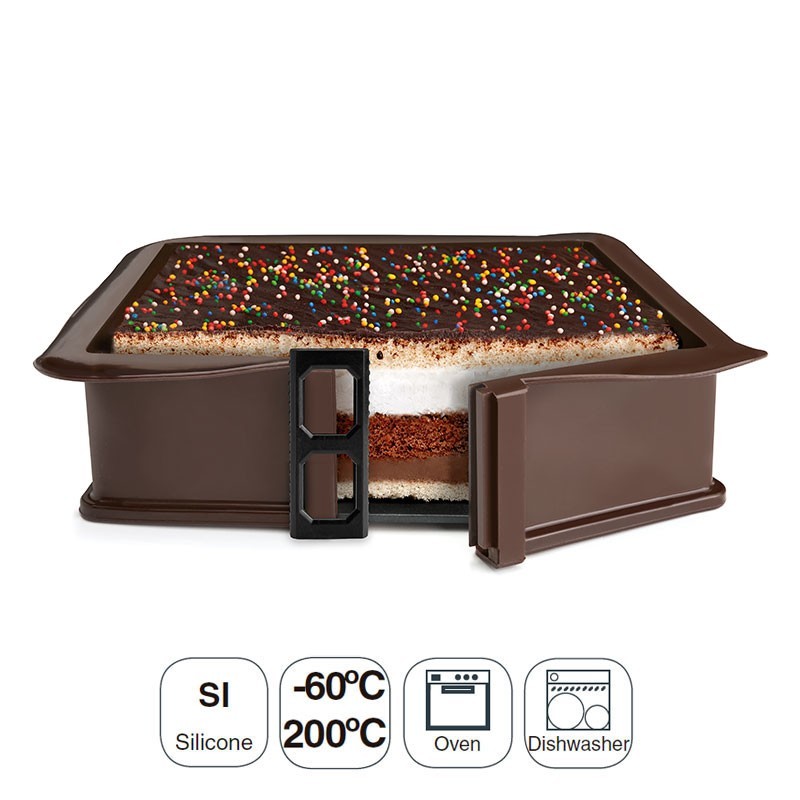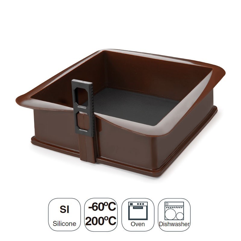 Molde destacável para bolos de 25x25 cm e 7,5 cm de altura fabricado em silicone, com base de vidro anti-aderente e antirralladuras.