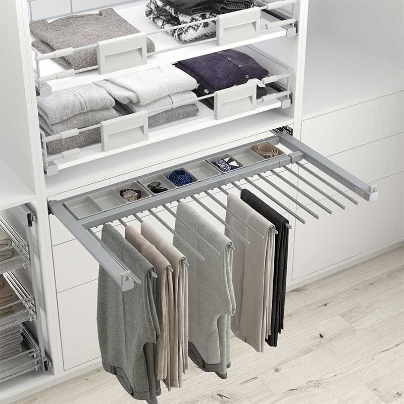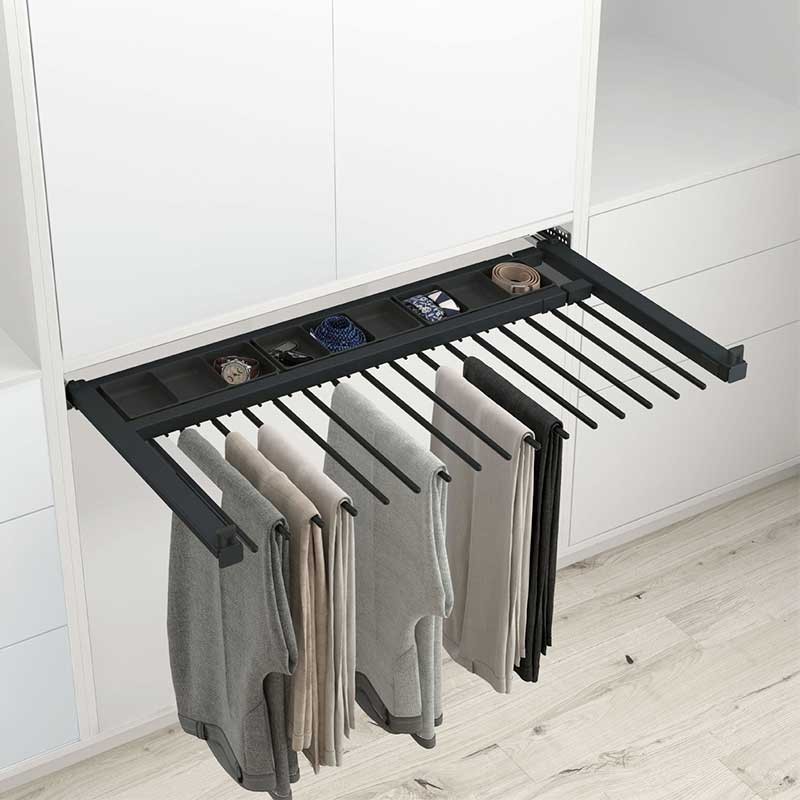 Suporte destacável para calças fabricado em aço com guias Hettich ajustáveis em largura, para carga de até 30 kg