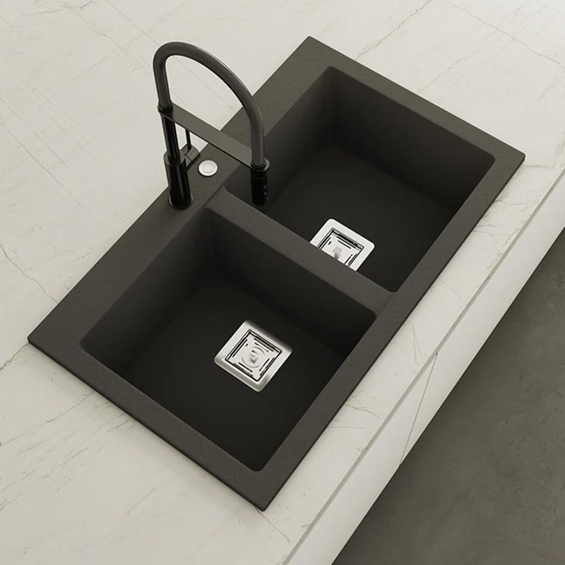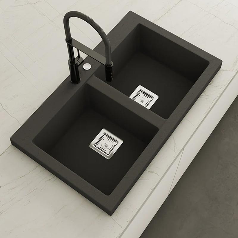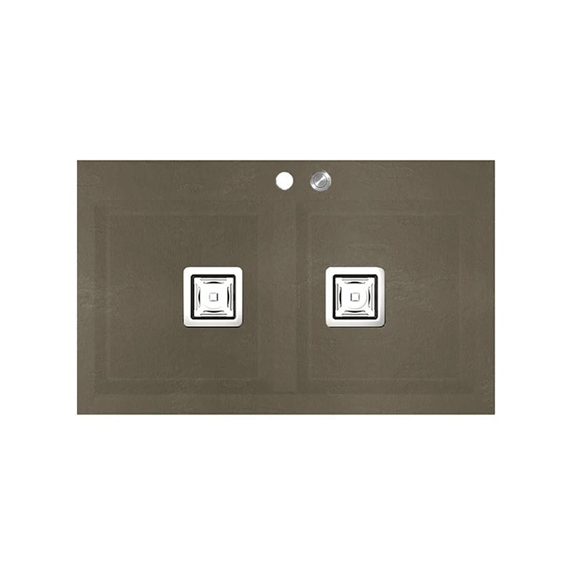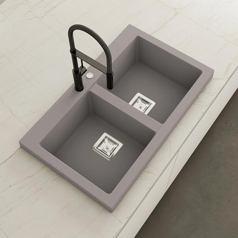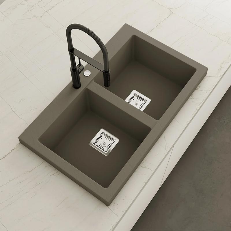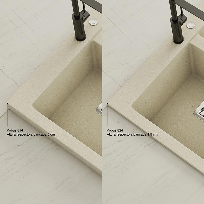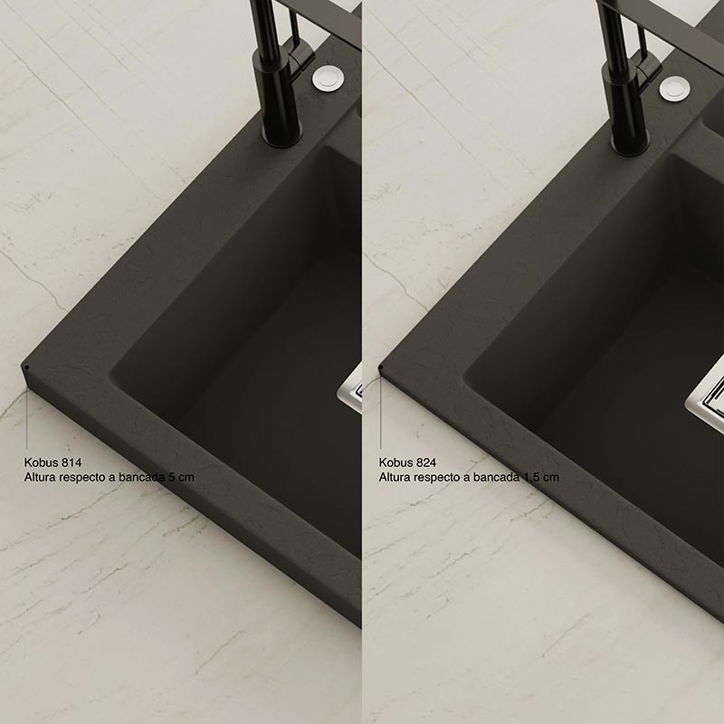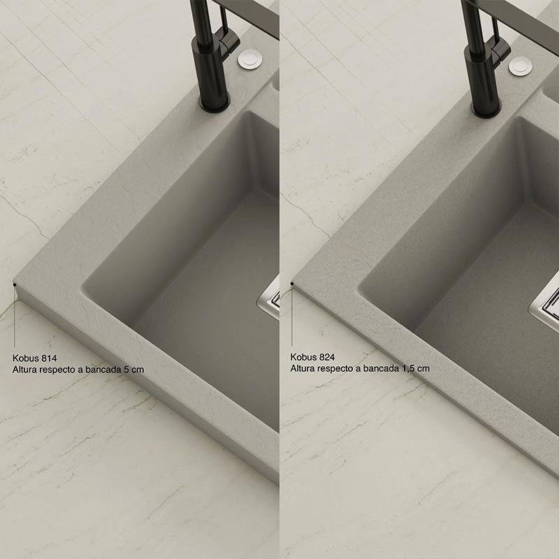 Fregadero de granito Hekla® modelo Kobus com textura ardósia mate. Projetado para instalação sobre bancada em móveis a partir de 90 cm.