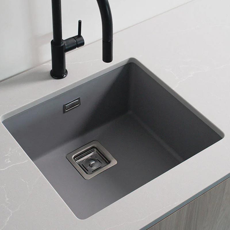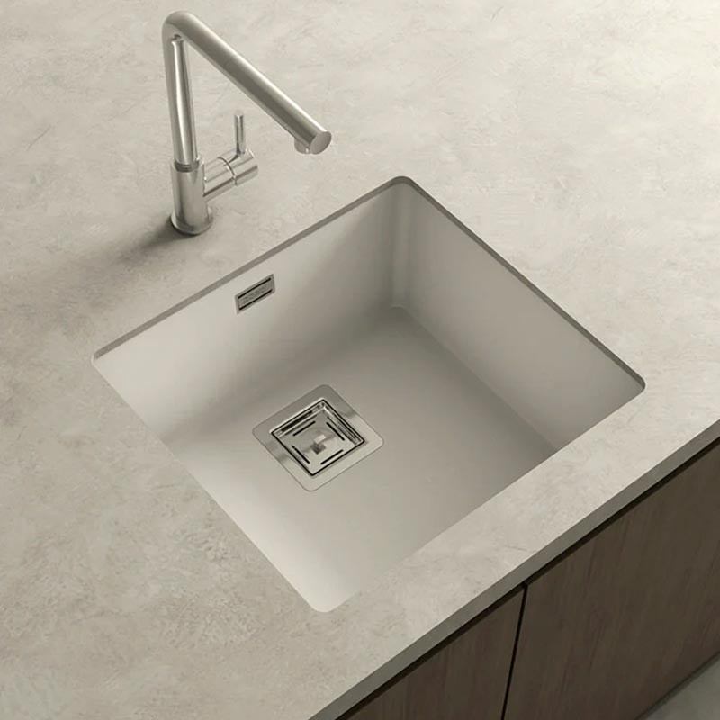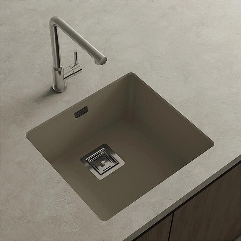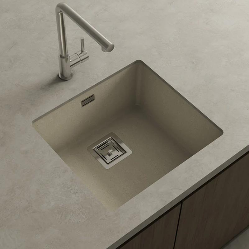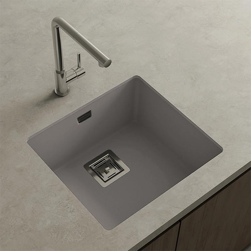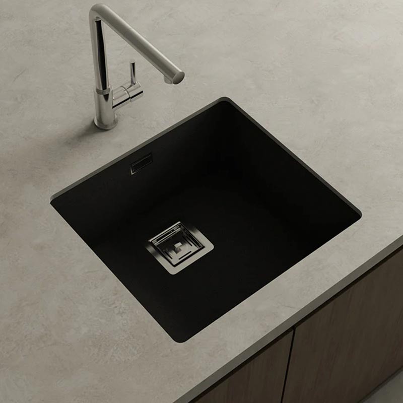 Pia de granito Hekla® modelo Zie 45 acabamento mate projetada para instalação em móveis de 60 cm mínimo sob bancada e de 50 cm sobre bancada.