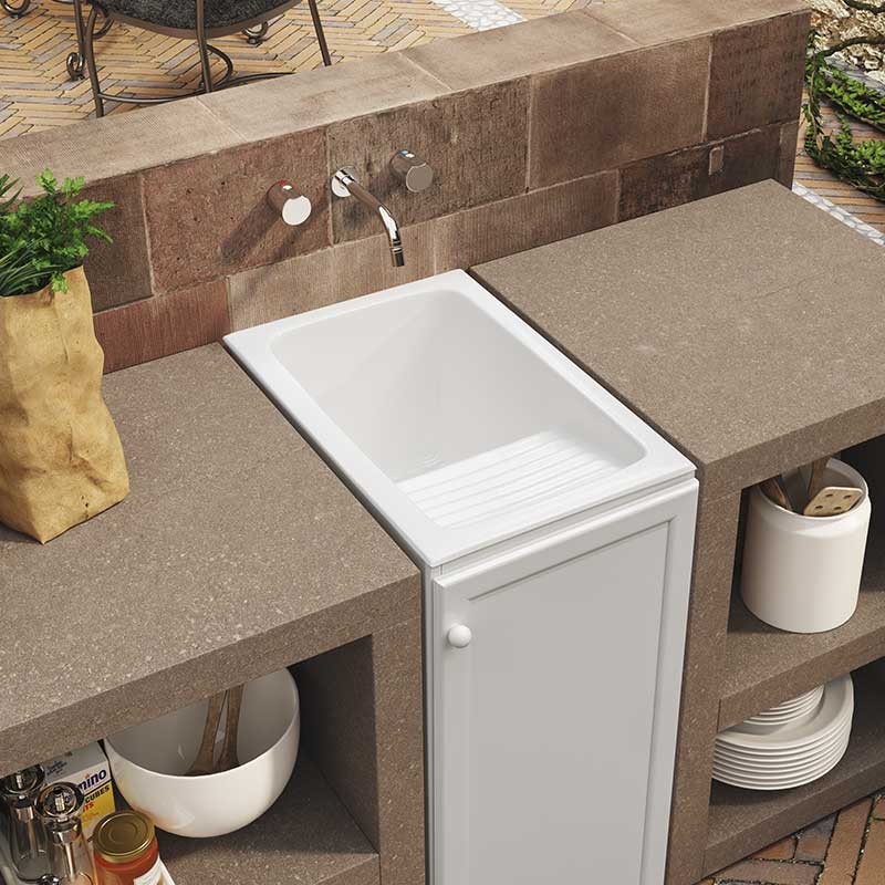 Lavanderia sobreencimera em resina sintética de alta resistência e dureza. Criados com gavetas profundas e área de rodo
