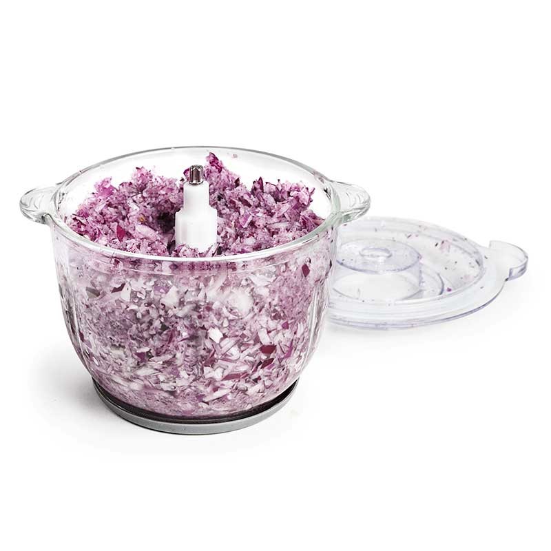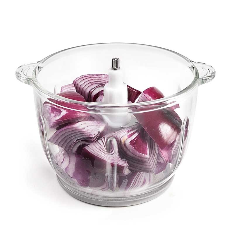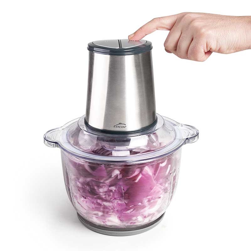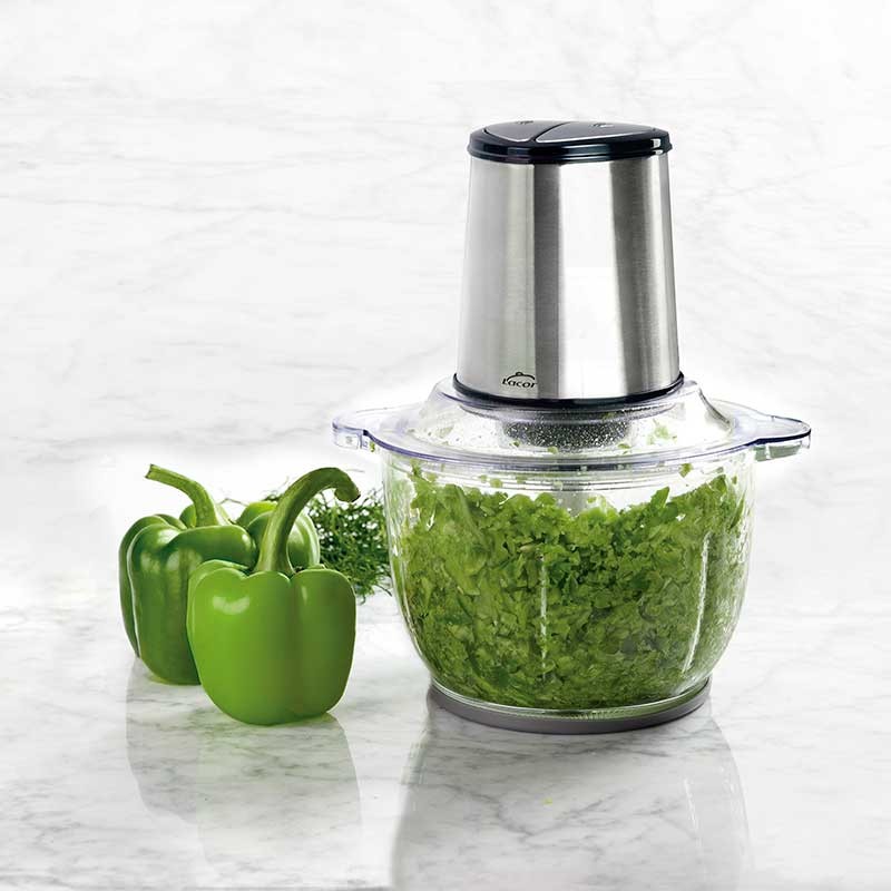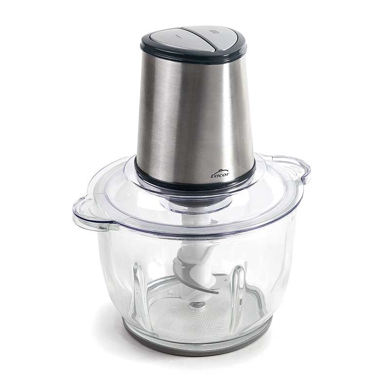 Picadora elétrica compacta com cabeça em aço inoxidável e recipiente de vidro de alta qualidade, de 2 litro de capacidade.
