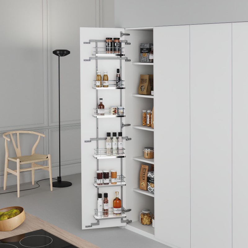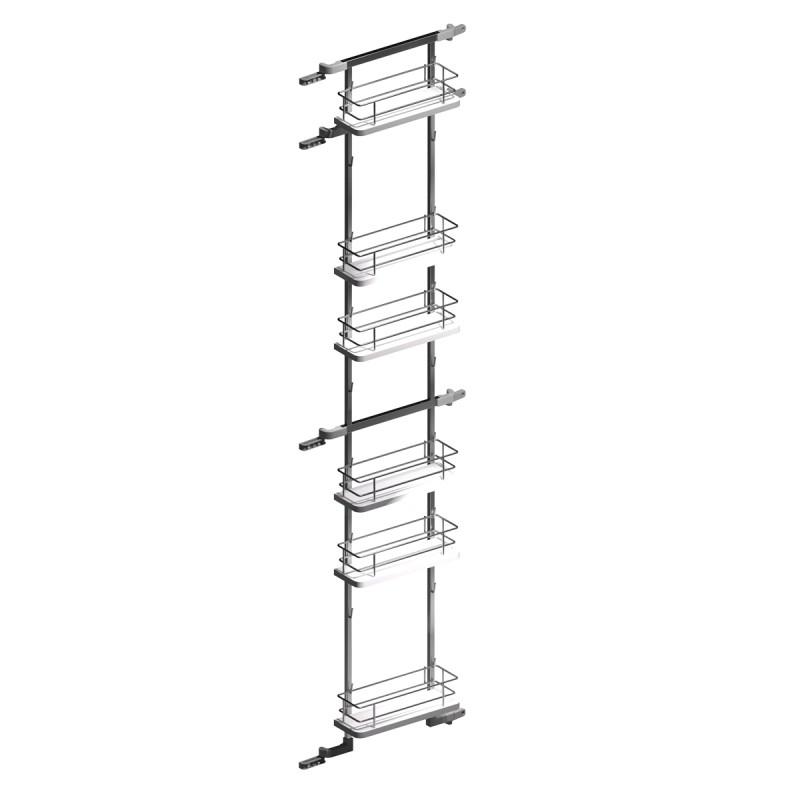 Prateleira despenseiro Compact para armário de cozinha tipo coluna, fabricado em aço com acabamento cromado e cestos com bases de melamina.