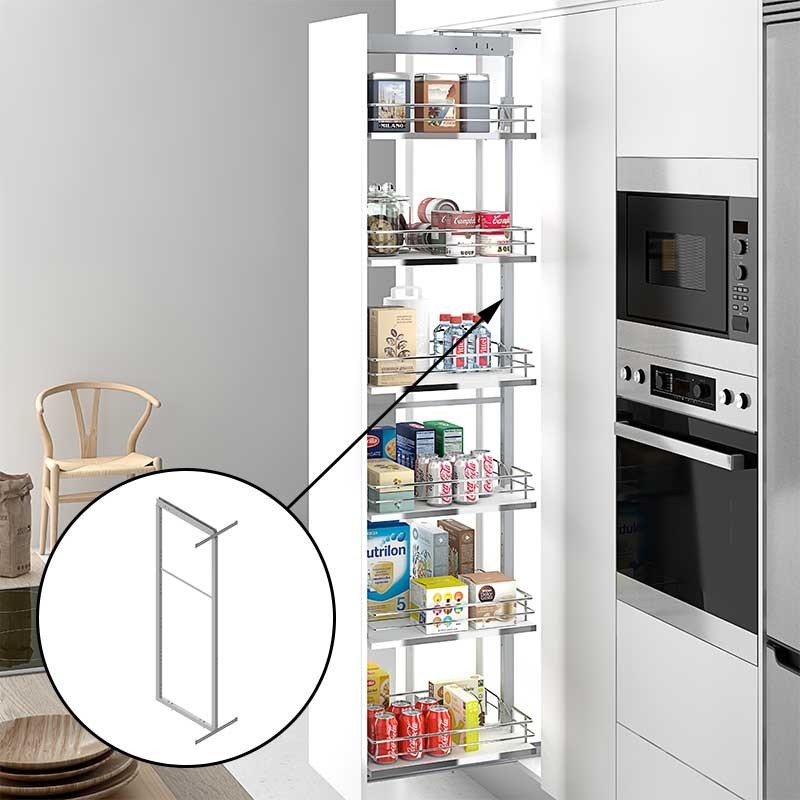 Carcaça extraível de aço com cestos cromados com base de melamina branca para rack coluna de cozinha. Disponível em várias medidas de altura e de largura.