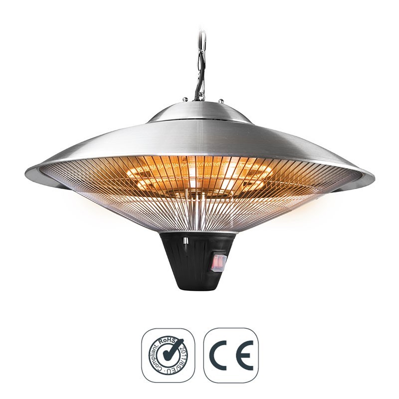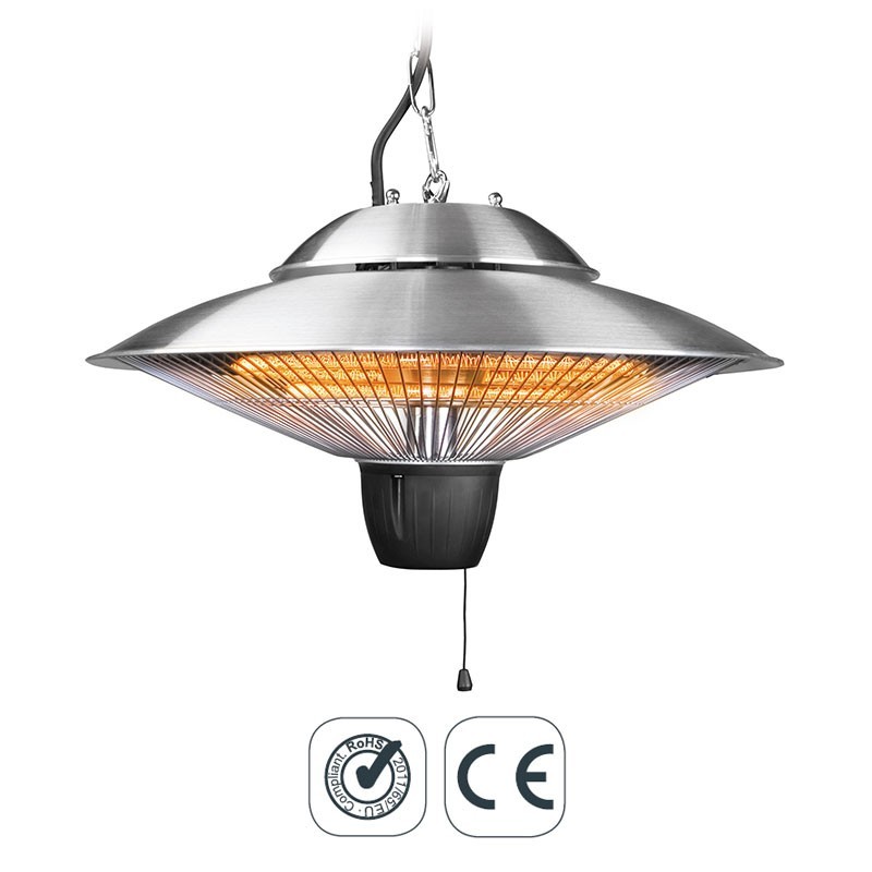 Aquecedor elétrico tipo lâmpada de teto ideal para terraços fabricado com refletor de aço inoxidável e uma lâmpada de halogéneo infravermelha. Disponível em 2 tamanhos.