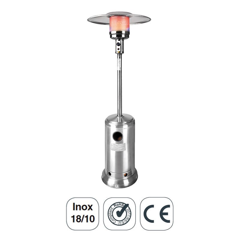 Aquecedor de pé a gás para esplanadas de bares ou restaurantes. Fabricado em aço inoxidável 18/10, com 224 cm de altura e refletor de Ø80 cm.