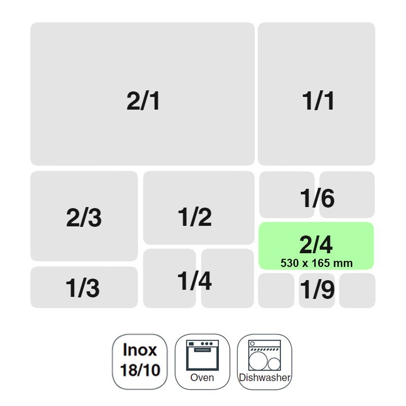 Balde tamanho GN 2/4 de 530x165 mm para cozinhas profissionais fabricada em aço inoxidável 18/10.