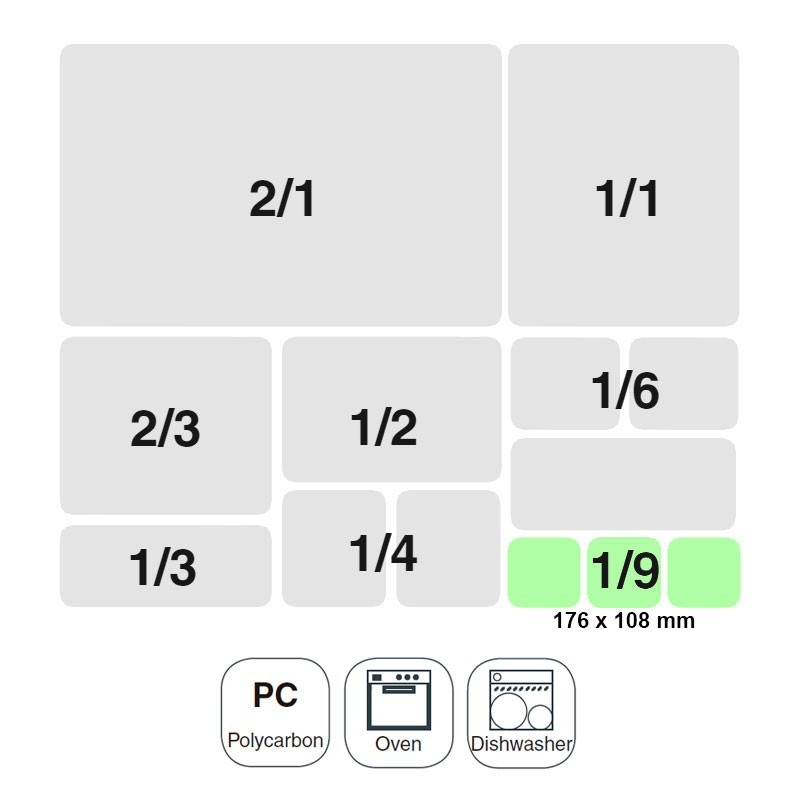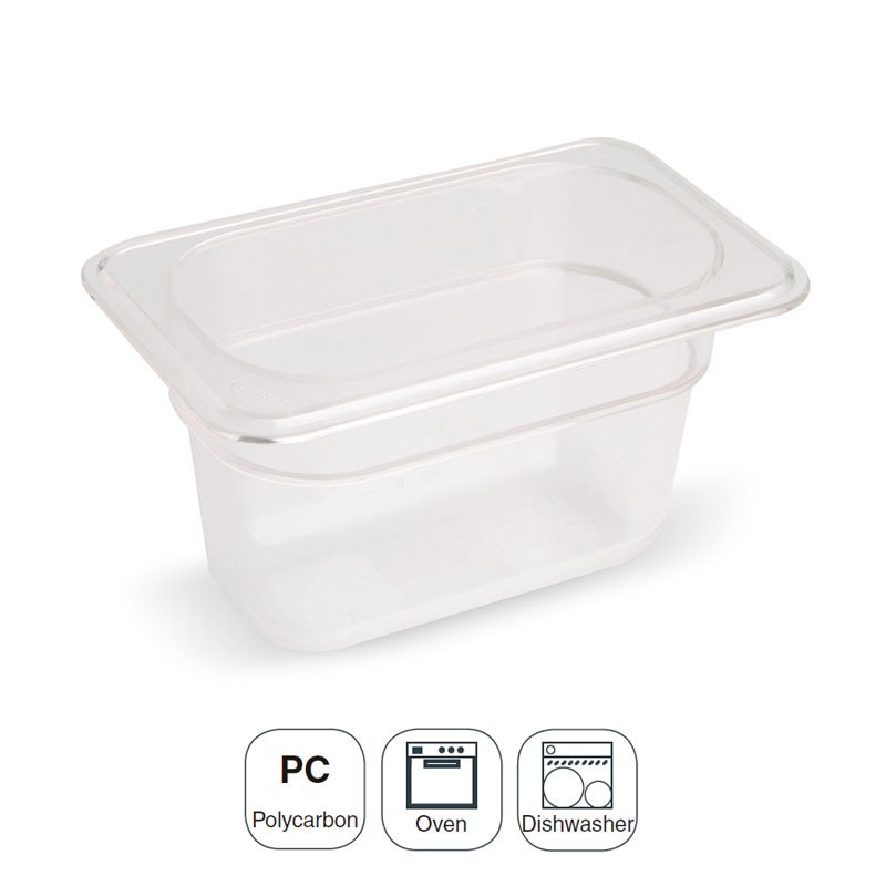 Balde tamanho GN 1/9 176x108 mm para cozinhas profissionais fabricada em policarbonato de alta qualidade leve e indeformável.