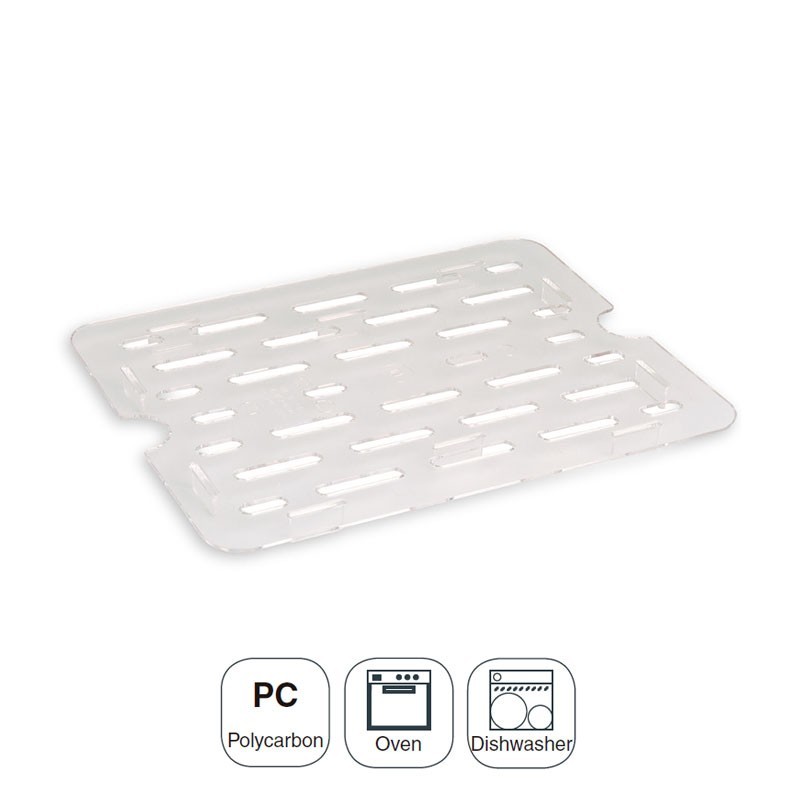Duplo fundo perfurado para recipientes Gastronorm para cozinhas profissionais, e fabricado em policarbonato de alta qualidade leve e indeformável. Disponível em várias medidas. Compatível apenas com cubetas de policarbonato.
