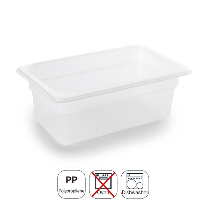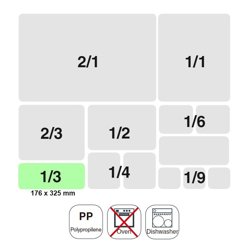 Balde tamanho GN 1/3 de 176x325 mm para cozinhas profissionais fabricada em polipropileno de alta qualidade, indeformável e leve.