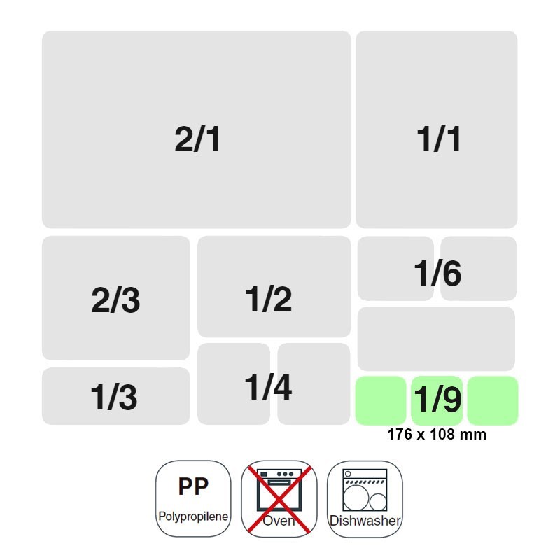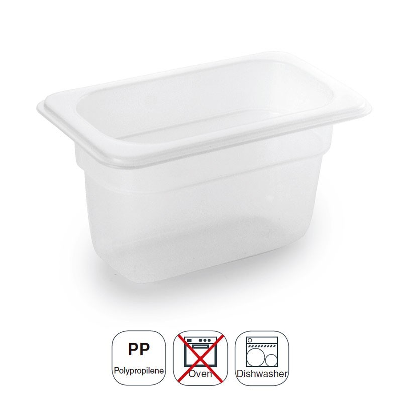 Balde tamanho GN 1/9 176x108 mm para cozinhas profissionais fabricada em polipropileno de alta qualidade, indeformável e leve.