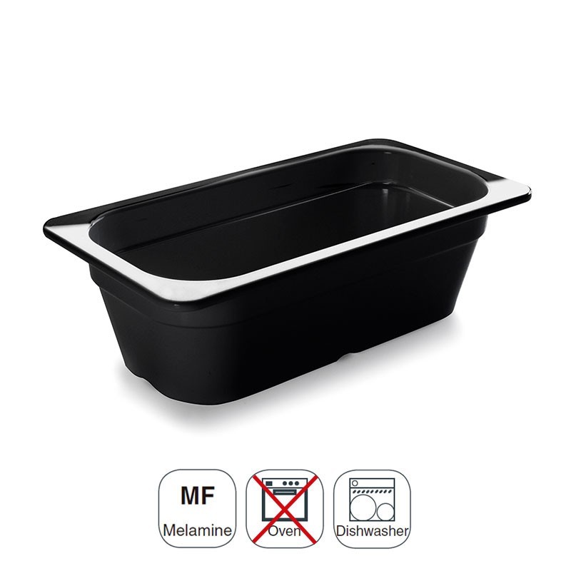 Balde tamanho GN 1/3 de 176x325 mm para cozinhas profissionais fabricada em resina sintética preta de alta resistência e qualidade.