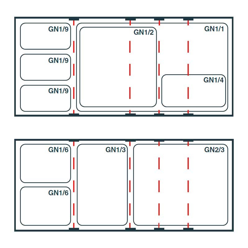 • Travessas verticais amovíveis, desenhadas para combinar cuvetes de diferentes tamanhos de até 200 mm de profundidade (Cuvetes GN não incluídas)