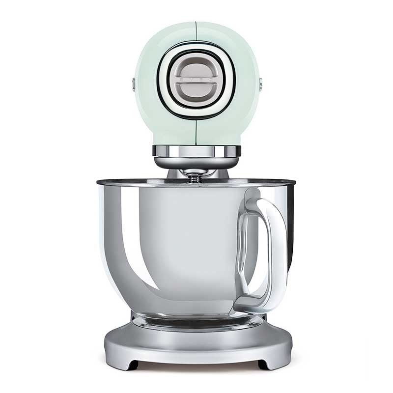 Smeg 50's estilo amassadeira com corpo em alumínio fundido, tampa superior em acabamento Verde Água Brilho, 800 W de potência e 10 velocidades.