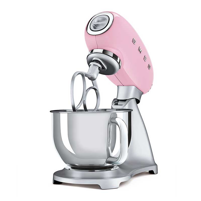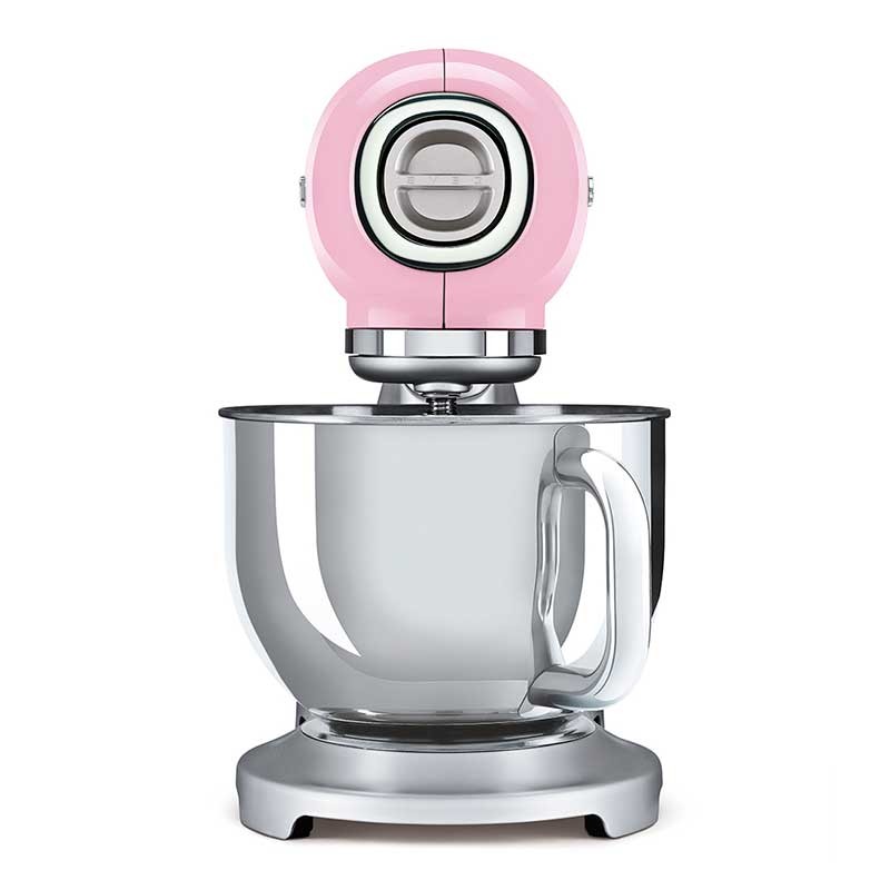 Smeg 50's Style batedeira com corpo em alumínio fundido, tampa superior em acabamento rosa brilho, 800 W de potência e 10 velocidades.