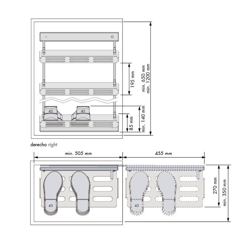 Bandejas de aço pintado na cor antracite para formar uma sapateira ideal para o seu armário ou closet. Conta com fechamento amortecido e extração total. Suporta uma carga máxima de 30 kg.
