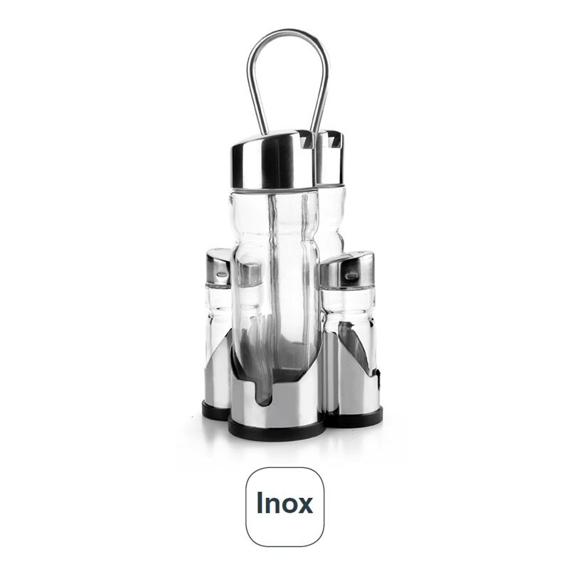 Jogo de galheteiro e de óleos de 175 ml cada um, mas saleiro e pimenteiro de 37,5 ml cada um, fabricado em aço inoxidável e vidro.