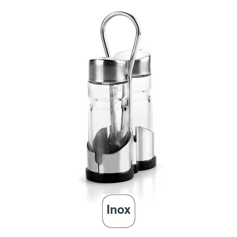 Jogo de saleiro e pimenteiro de 37,5 ml de capacidade por cada embarcação, fabricado em aço inoxidável e vidro.