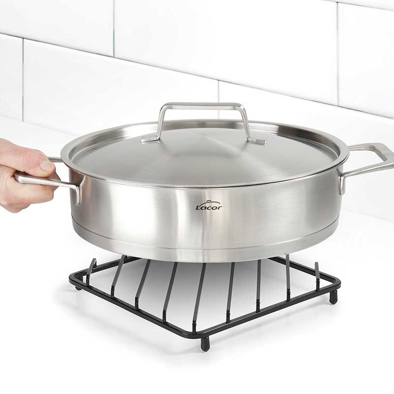 Base para tachos quadrado de haste de fio de aço resistente e durável com acabamento em preto fosco. Ideal para colocar as panelas, colheres e outros objetos quentes.