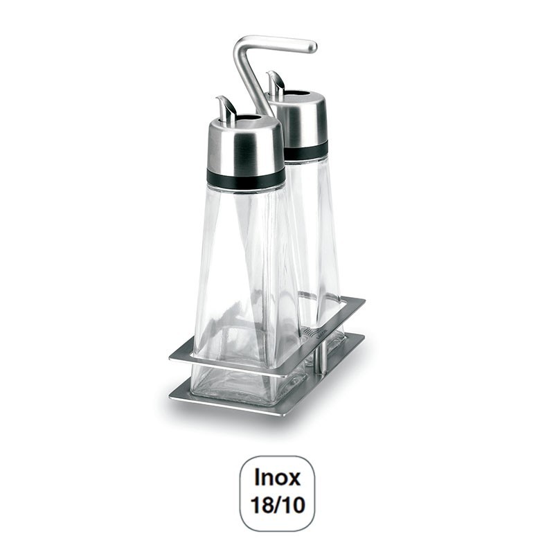 Jogo de óleos-galheteiro Série Hiper-Luxe de 2 peças com suporte fabricadas em aço inoxidável 18/10 de grande qualidade e resistência à corrosão.