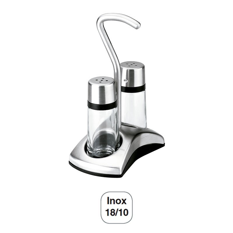 Jogo de saleiro-pimenteiro Série de Luxe de 2 peças com suporte fabricadas em aço inoxidável 18/10 de grande qualidade e resistência à corrosão.