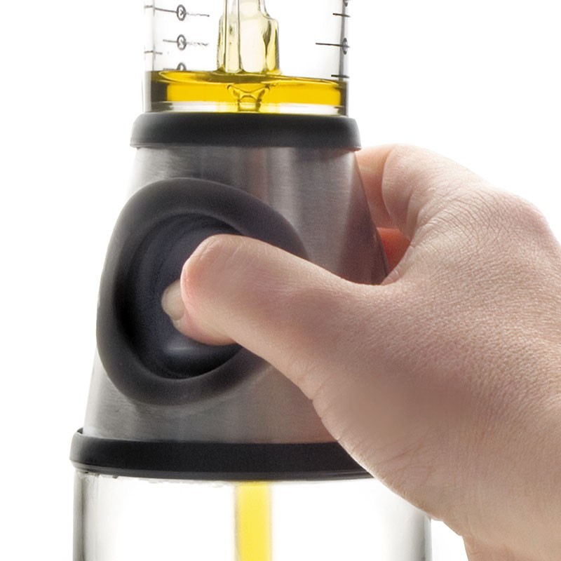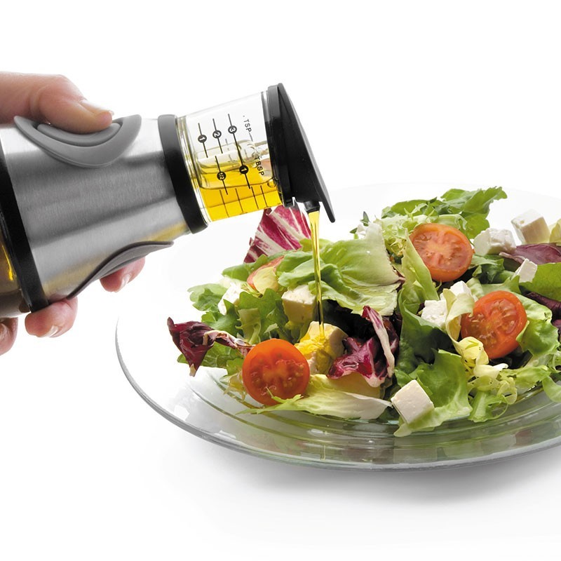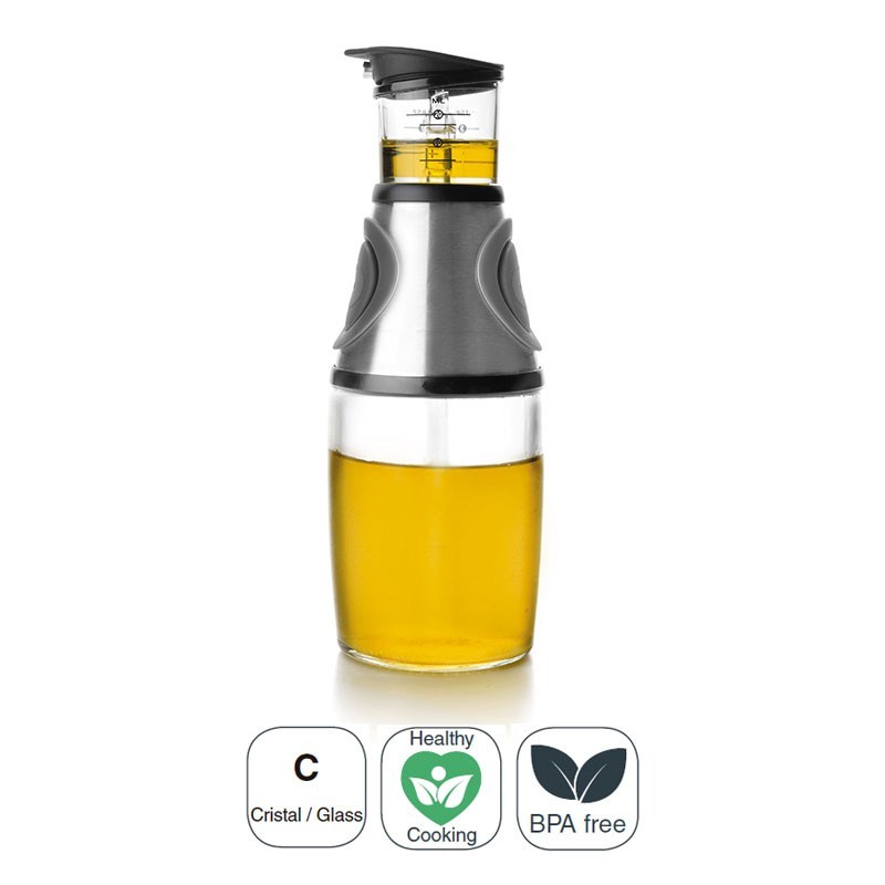 Dosador de óleo com o medidor fabricado em vidro e aço inoxidável. Ao pressionar o botão o óleo sobe até o medidor e você está pronto para dosar a quantidade desejada. Medidas: 7,8x23 cm Capacidade: 250 ml.