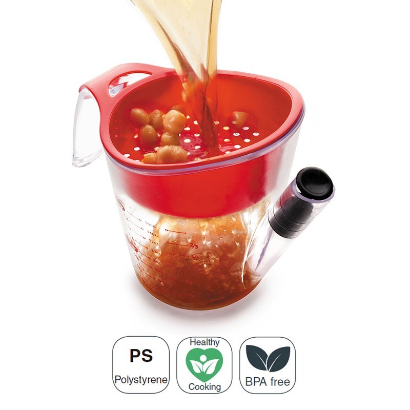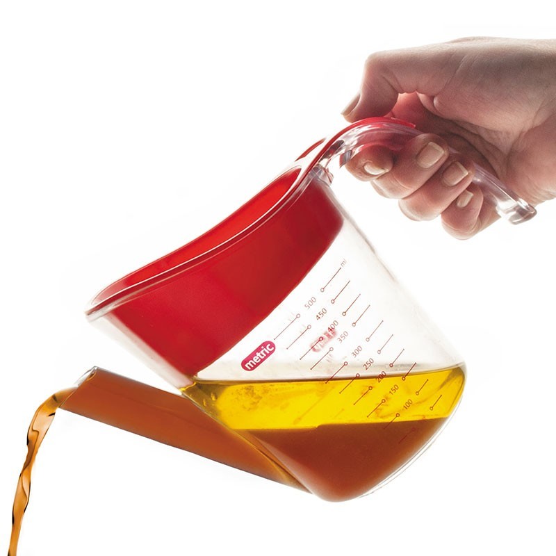 Jarro separadora de gorduras de 500 ml fabricado em poliestireno com filtro resistente ao calor e 3 sistemas de medição (ml-oz-copos).