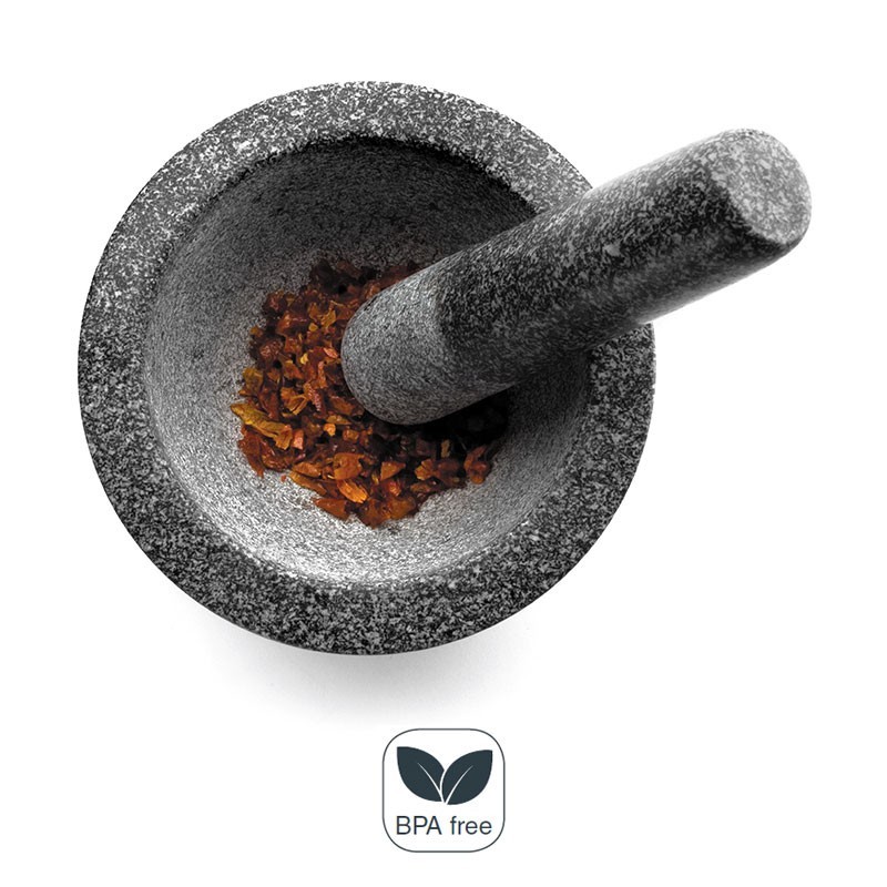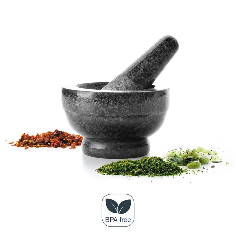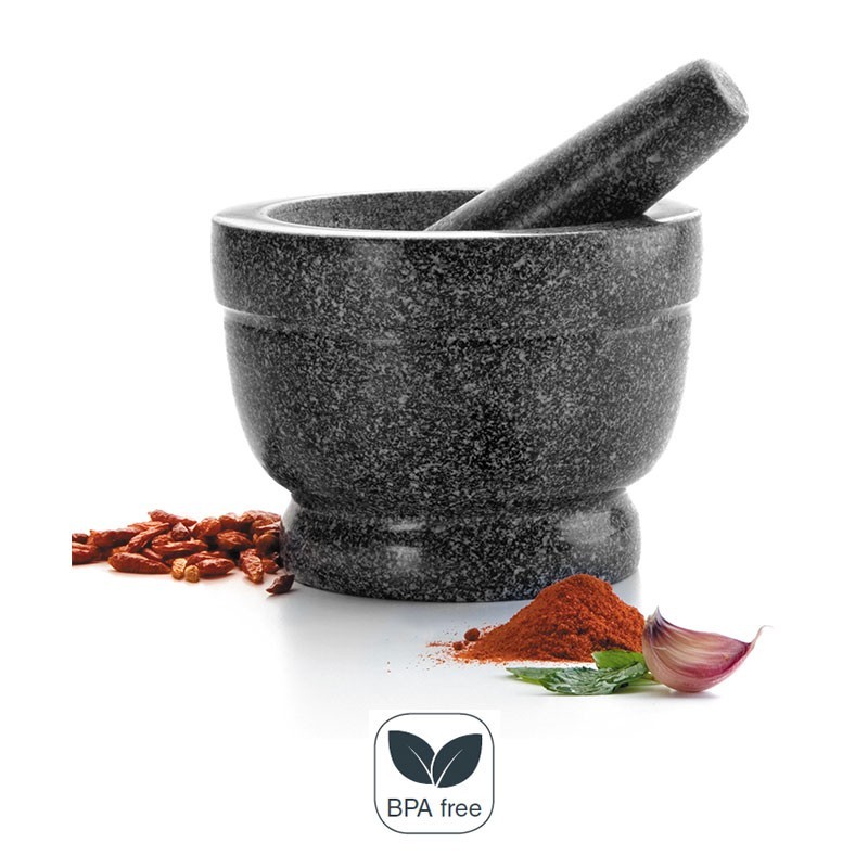 Almofariz com mão fabricado em granito de alta qualidade cor preto com interior não poroso. Disponível em várias medidas.