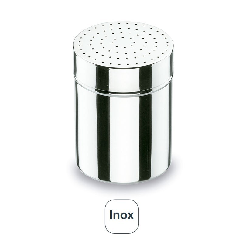 Porta-condimentos grande de aço inoxidável e furos pequenos com uma capacidade de 300 gramas, 7 cm de diâmetro e 9,5 cm de altura.