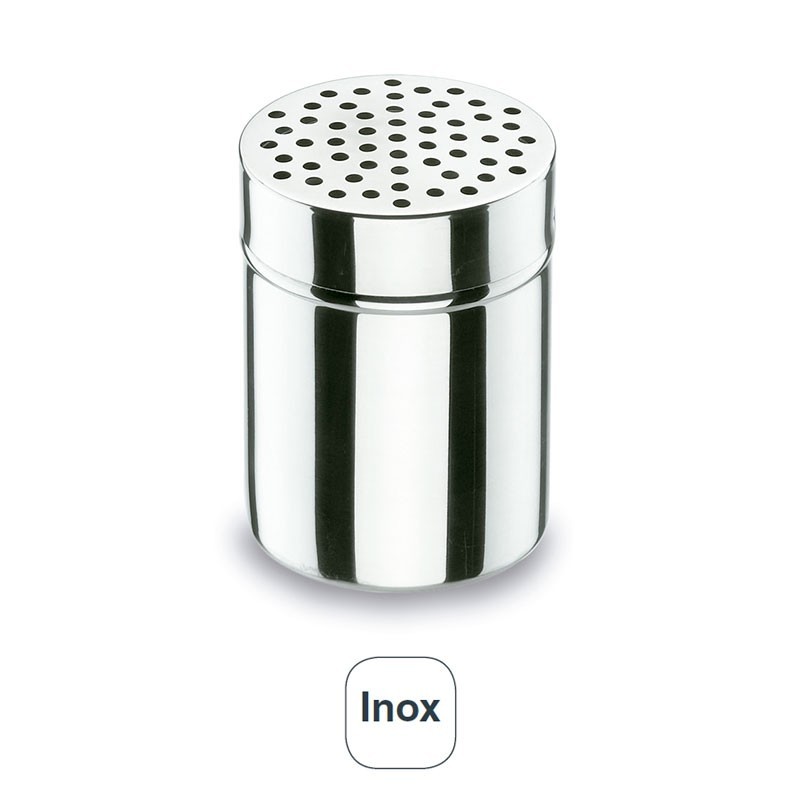 Porta-condimentos com furo grandes para queijo fabricado em aço inoxidável com capacidade de 300 gramas, 7 cm de diâmetro e 9,5 cm de altura.
