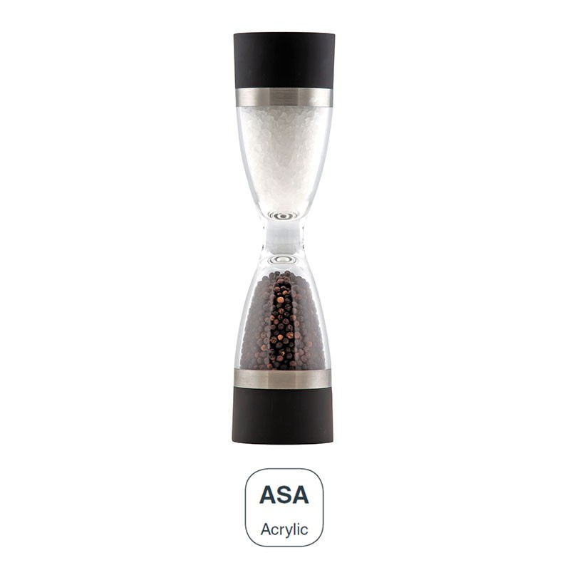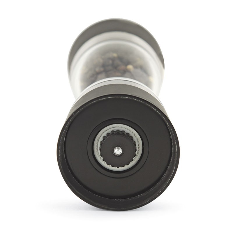 Moinho 2 em 1 para sal e pimenta do 6x18 cm fabricado em acrílico com mecanismo cerâmico de alta resistência e qualidade. Antiderrapantes na parte superior e inferior.