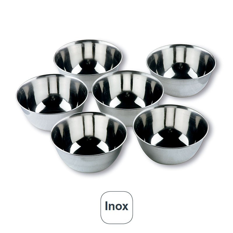 Conjunto de 6 bacias menores de 12 cm de diâmetro e 325 ml de capacidade, fabricados em aço inoxidável de alta qualidade e alta resistência à corrosão.