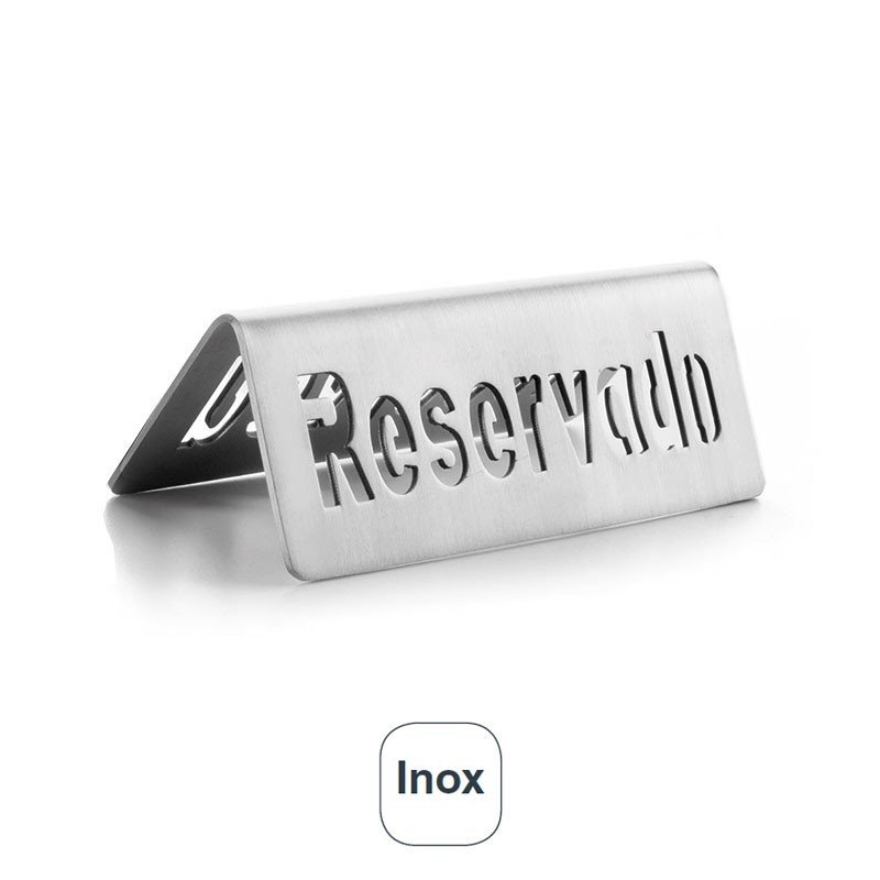 Placa de Reservado de 5x12 cm fabricada em aço inoxidável de grande qualidade, ideal para identificar mesas ocupadas em salões, bares e restaurantes.