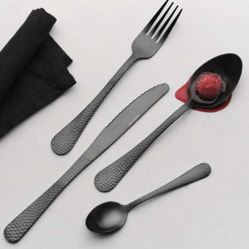 Conjunto de 24 talheres Comas série Luna Black fabricados em aço inoxidável 18% cromo, livre de níquel e 1,8 mm de espessura.