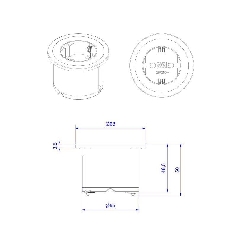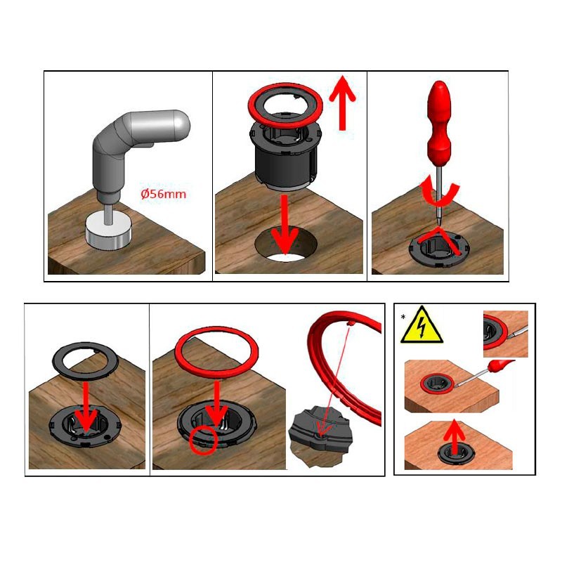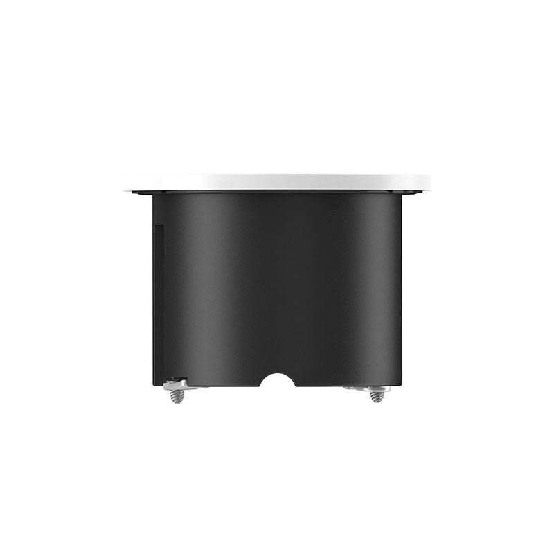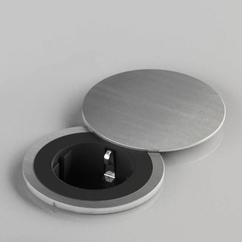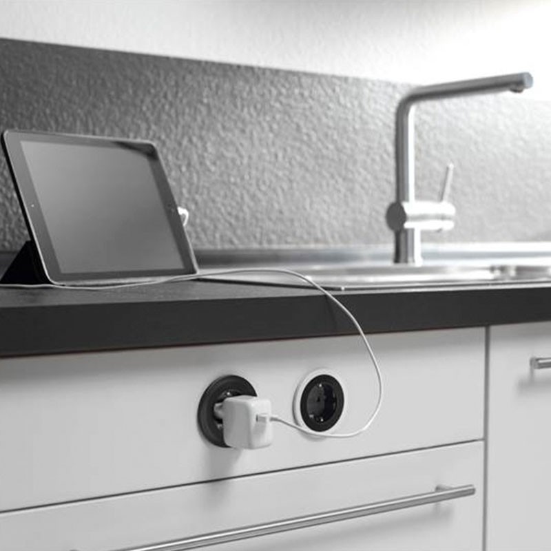 Tomada redonda para encastrar na parede ou em móveis de cozinha com ficha Schuko preta e 3 anéis externos intercambiáveis incluídos em 3 acabamentos diferentes; branco, preto e inox.