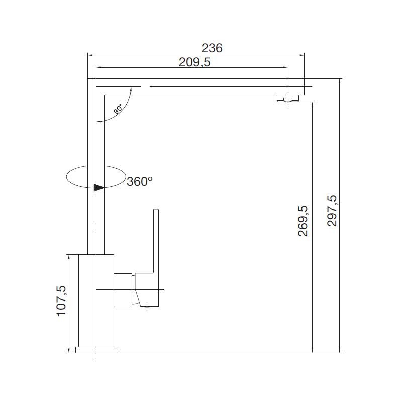 Torneira monocomando modelo Maia Esquadra de 29,7 cm de altura, rotação 360º e acabamento cromado para pia de cozinha. Cartucho cerâmico de 25 mm Instalação vertical sobre a borda.