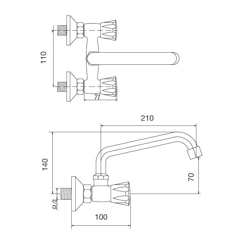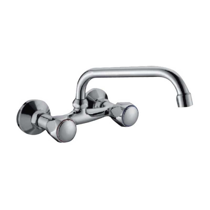 Torneira bimando armação de cerâmica modelo Aida acabamento cromado para pia de cozinha. Projeto tipo mural para instalação em parede. Distância entre tiros: 11 cm