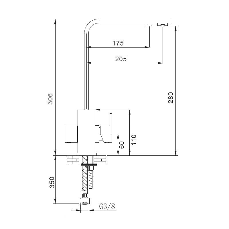 Torneira de dupla função, de 3 vias e dupla saída (rede de água e água de osmose) modelo Angular Plano de 30,6 cm de altura e acabamento cromado para pia de cozinha. Cartucho cerâmico de 35 mm de entrega fixa para a água convencional e montagem cerâmica para água osmotizada.