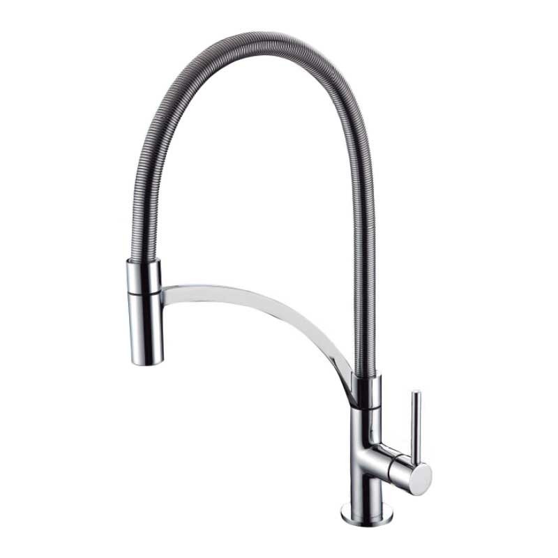 Torneira misturadora com bico flexível tipo mola modelo Alcor de 45,7 cm de altura e acabamento cromado para pia de cozinha. Instalação vertical sobre a borda.