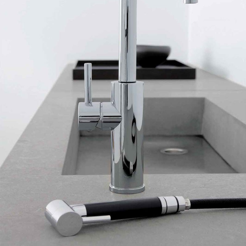 Torneira de cozinha modelo Mitu Tele-Chuveiro do tipo monocomando e design italiano em aço inoxidável, acabamento cromado ou níquel para você escolher.