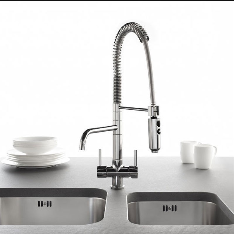 Torneira de cozinha modelo Pure Prof tipo chuveiro, osmose e design italiano em aço inoxidável, acabamento cromado brilho.