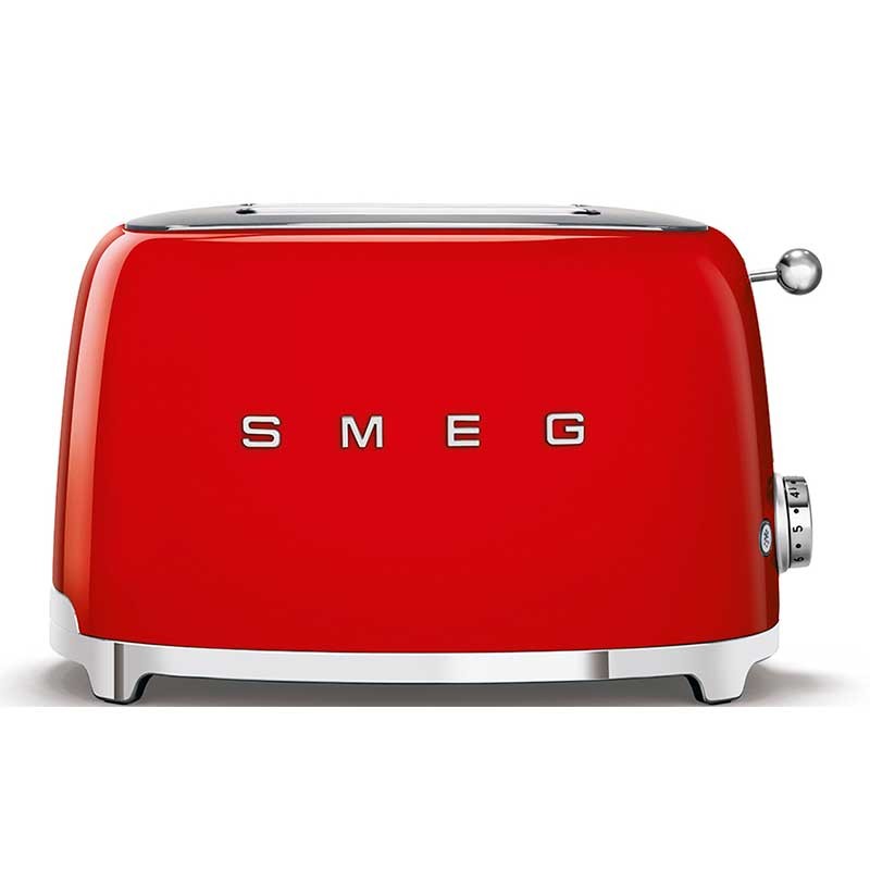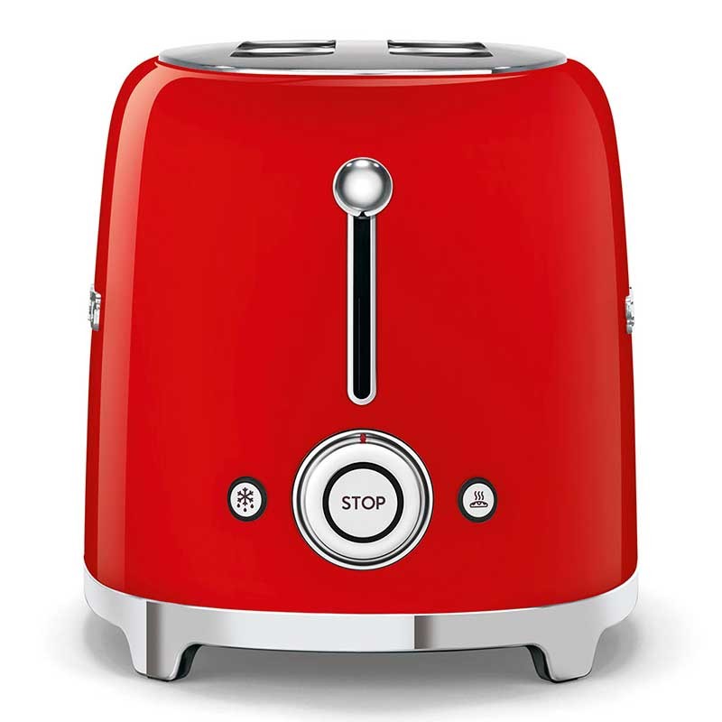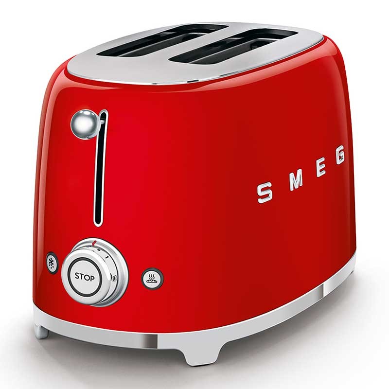 Torradeira Smeg 50's Style com corpo em aço inoxidável Cor vermelha brilho com 6 níveis de aquecimento e 2 ranhuras para 2 torradas.