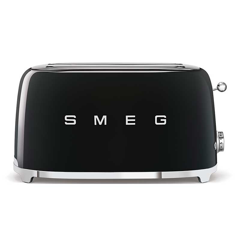 Torradeira Smeg 50's Style com corpo em aço inoxidável Cor preto brilho com 6 níveis de aquecimento e 2 ranhuras para 4 torradas.