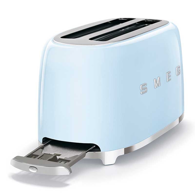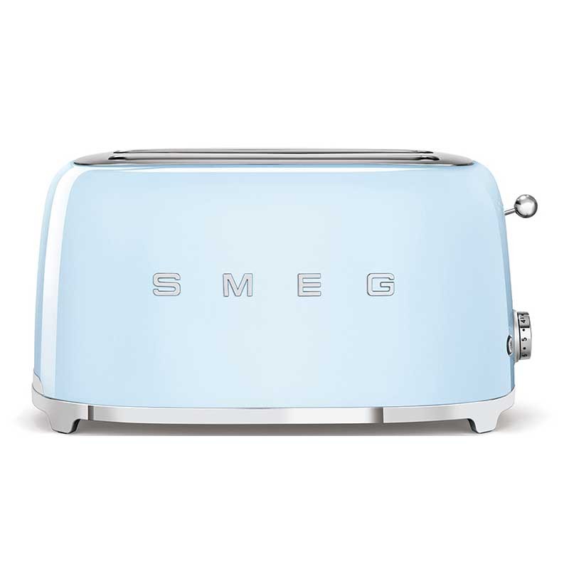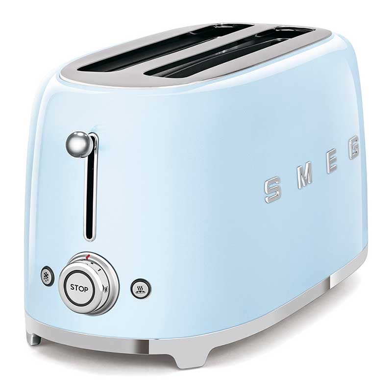 Torradeira Smeg 50's Style com corpo em aço inoxidável Cor Azul céu brilho com 6 níveis de aquecimento e 2 ranhuras para 4 torradas.