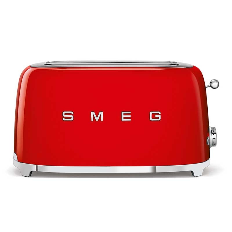 Torradeira Smeg 50's Style com corpo em aço inoxidável Cor vermelha brilho com 6 níveis de aquecimento e 2 ranhuras para 4 torradas.