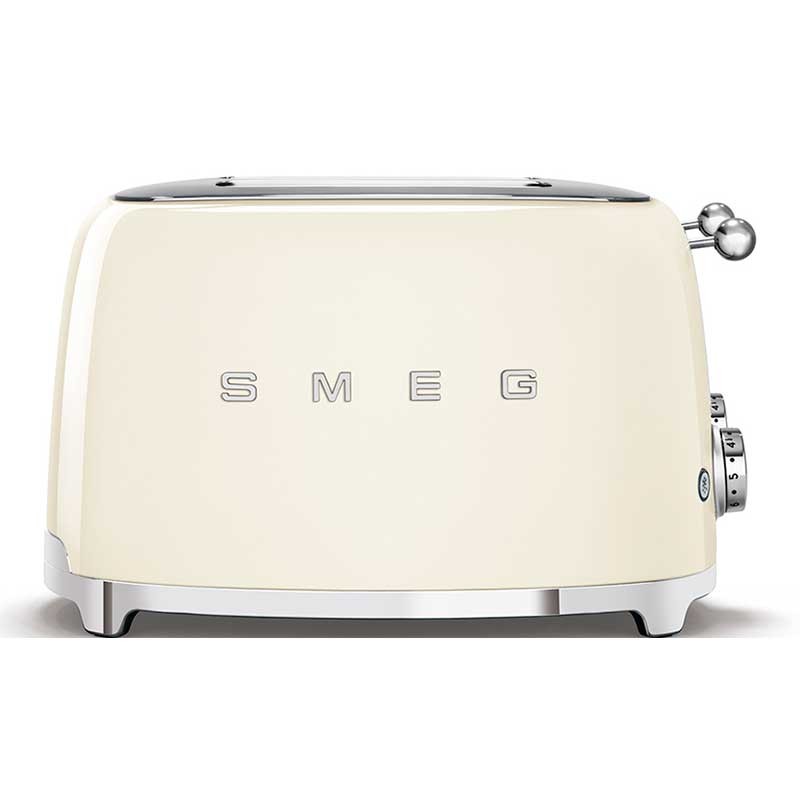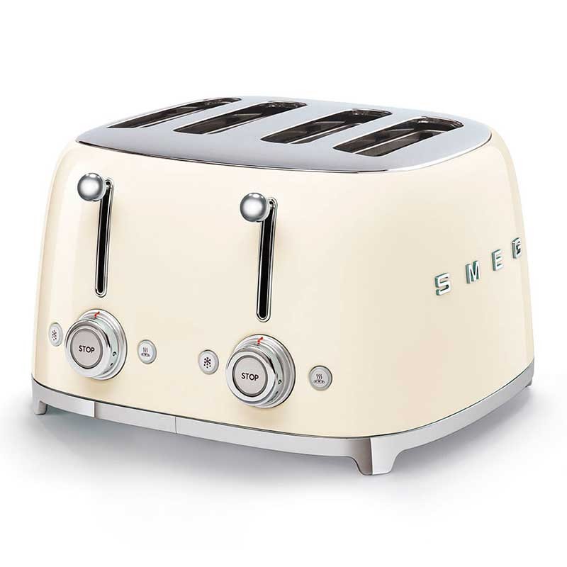 Torradeira Smeg 50's Style com corpo em aço inoxidável Cor Creme brilho com 6 níveis de aquecimento e 4 ranhuras para 4 torradas.