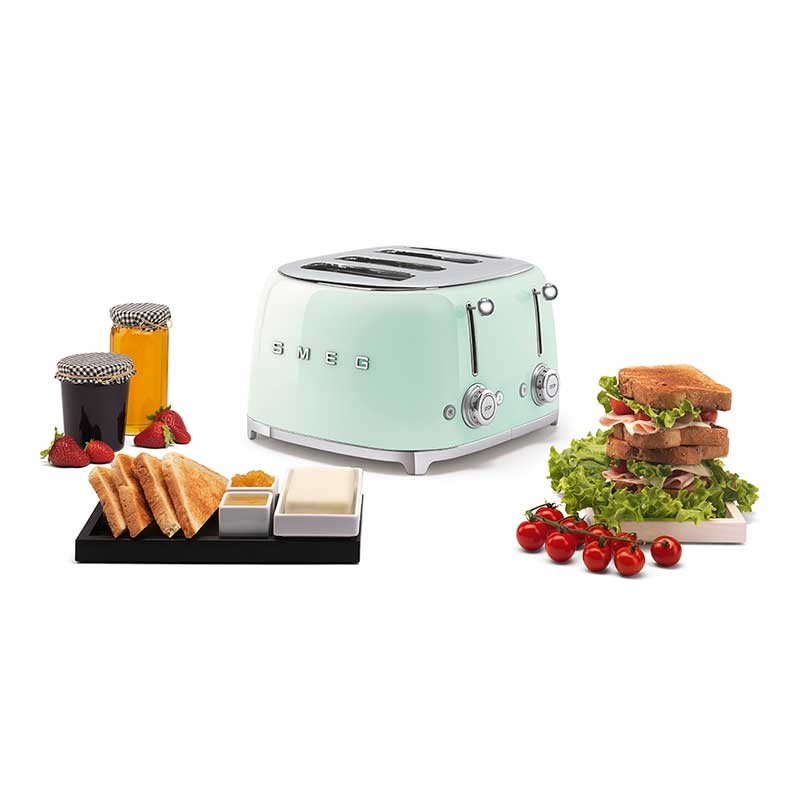 Torradeira Smeg 50's Style com corpo em aço inoxidável Cor Verde Água Brilho com 6 níveis de aquecimento e 4 ranhuras para 4 torradas.