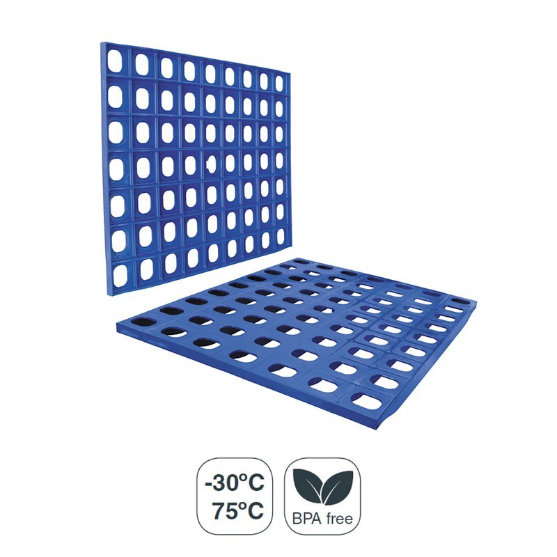 Prateleira grade de polietileno azul para estante modular. Disponível em diversas medidas, de acordo com o padrão para recipientes Gastronorm.