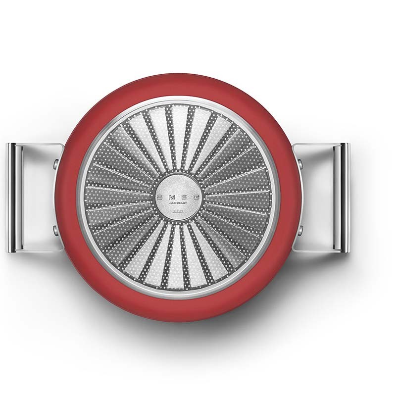 Panela antiaderente com tampa Smeg 50's Style com 24 cm de diâmetro, corpo em alumínio forjado e acabamento externo vermelho fosco.