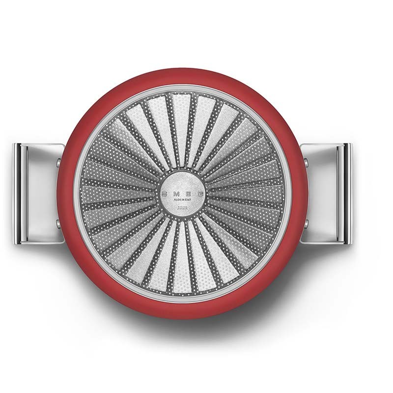 Panela alta antiaderente com tampa Smeg 50's Style de 26 cm de diâmetro, corpo em alumínio forjado e acabamento externo vermelho fosco.